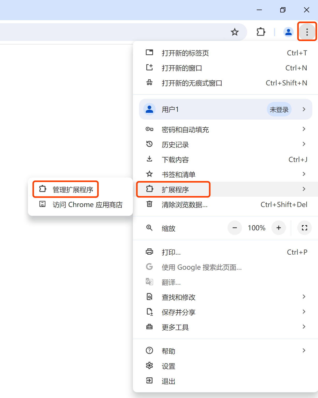 3.打开管理扩展程序:点开右上角菜单找到扩展程序->管理扩展程序点击进入,
