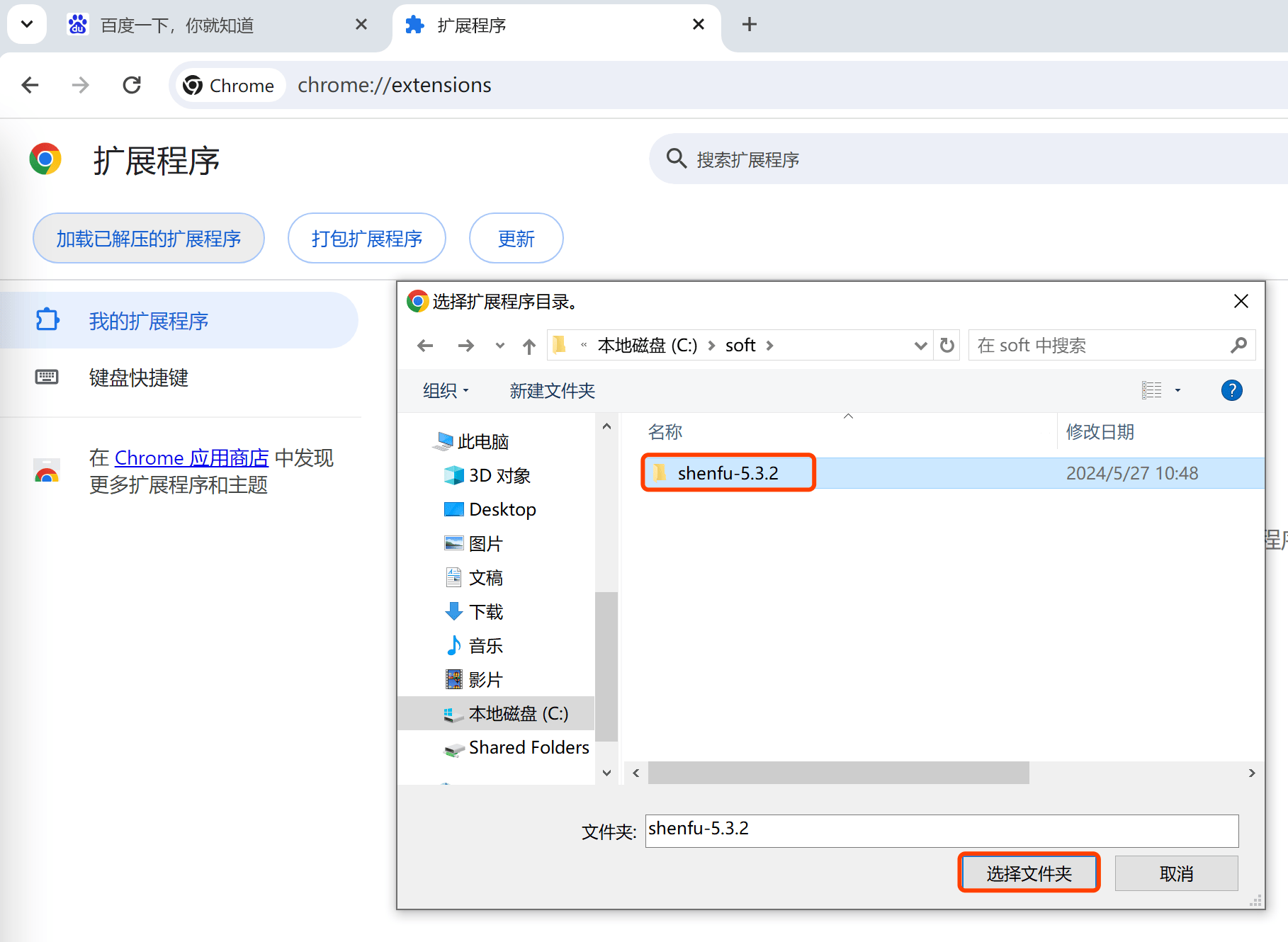 5.选择扩展程序:找到之前已解压好的扩展程序,选择扩展程序所在的文件夹。