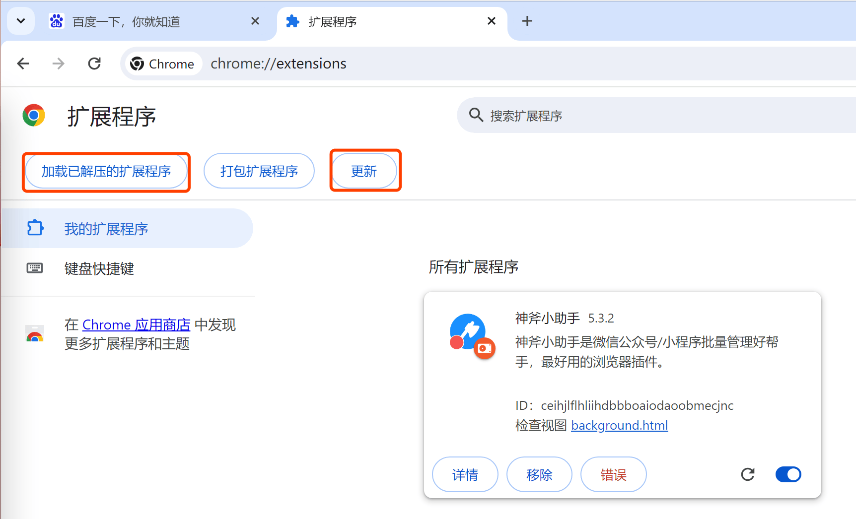 方法1: 下载升级包文件,并把它全部解压到一个新目录。 点击加载已解压的扩展程序,选择升级包完成升级。
